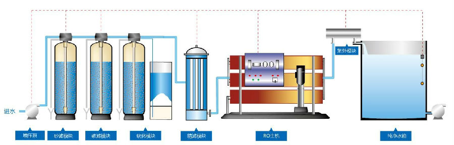 原水箱→增壓泵→多介質(zhì)過(guò)濾器→活性炭過(guò)濾器→保安過(guò)濾器→高壓泵→一級(jí)反滲透→純水箱