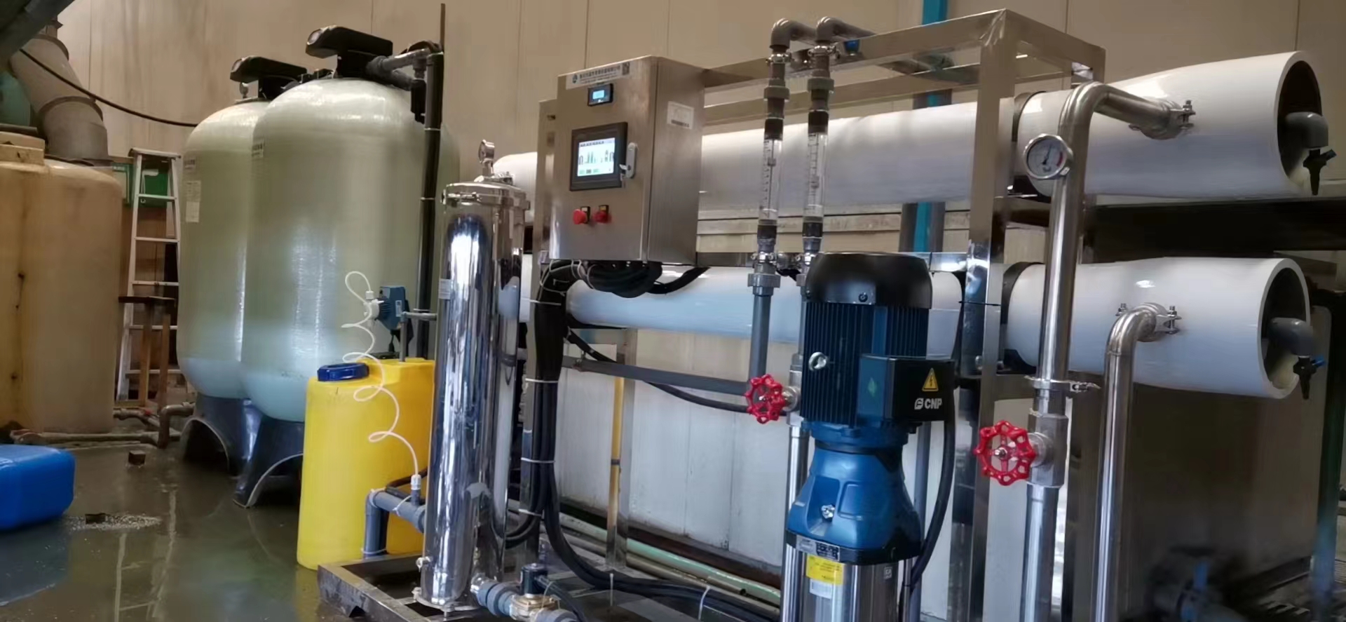 我們這套純水設(shè)備采用預(yù)處理+反滲透主機(jī)+輸送系統(tǒng)的工藝流程: