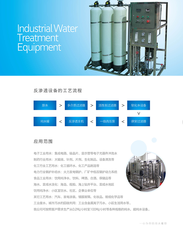原水----原水泵----機(jī)械過濾器----活性炭過濾器----軟化過濾器(或阻垢劑)----保安過濾器----高壓泵----反滲透裝置----純水箱----純水輸送泵----后處理----使用點(diǎn)